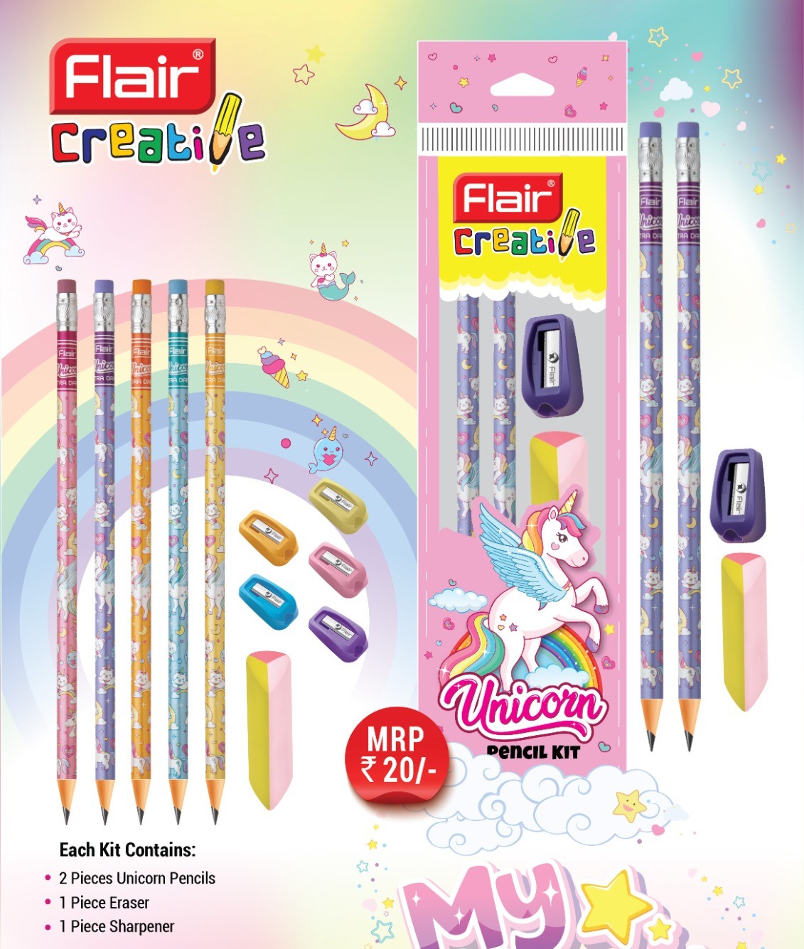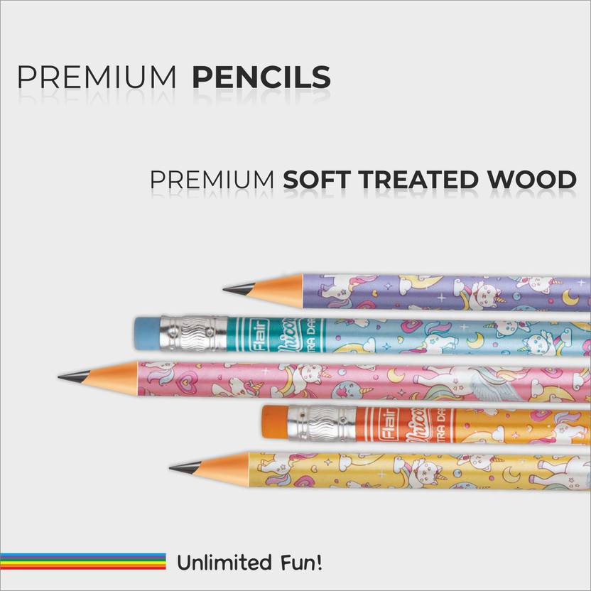 FLAIR Creative Unicorn 2B Graphite Pencils Pack of 10 | Round Body Wooden Pencils for School, Office and Exams | Extra Dark Lead Pencils for Students, Childrens | Includes 1 Eraser and 1 Sharpener